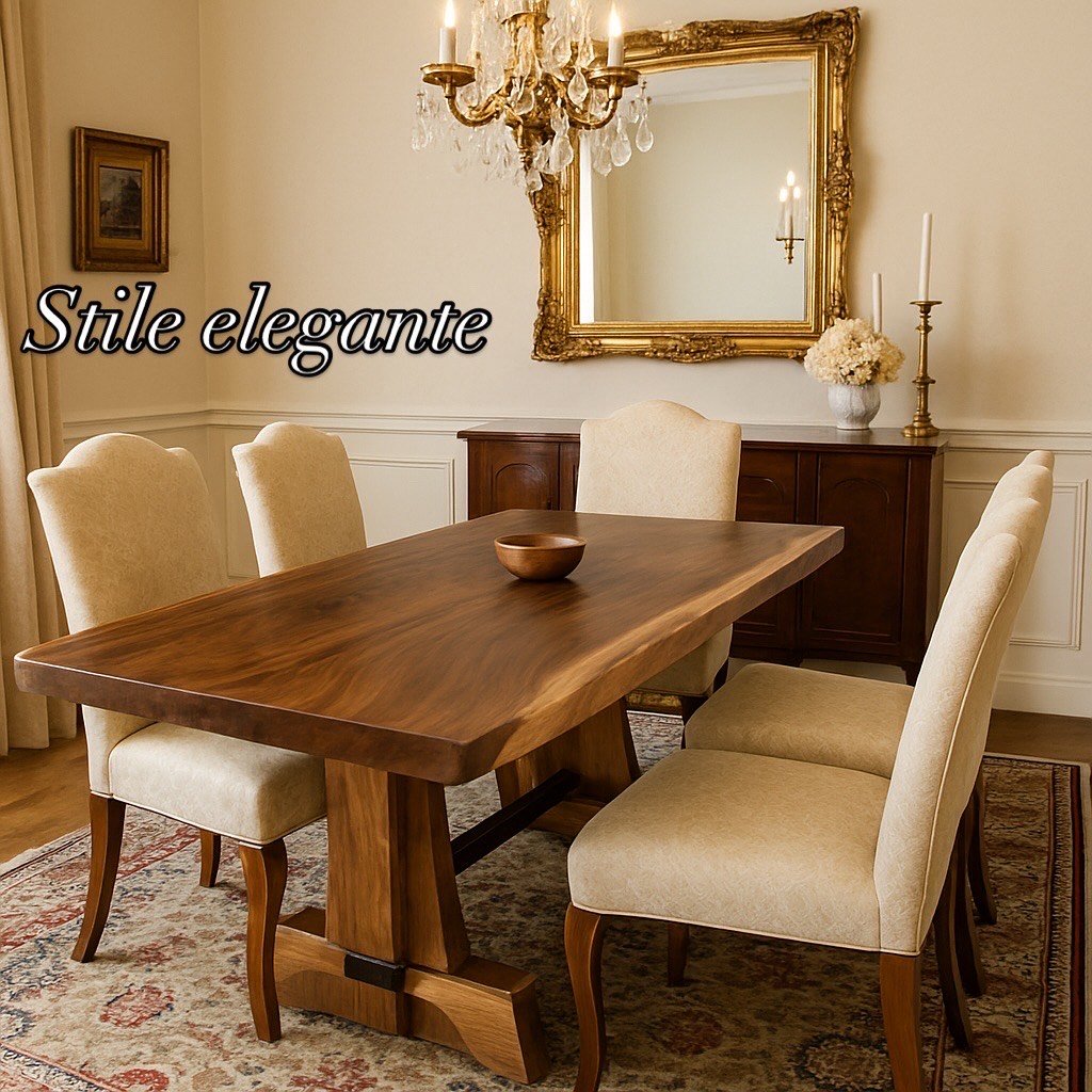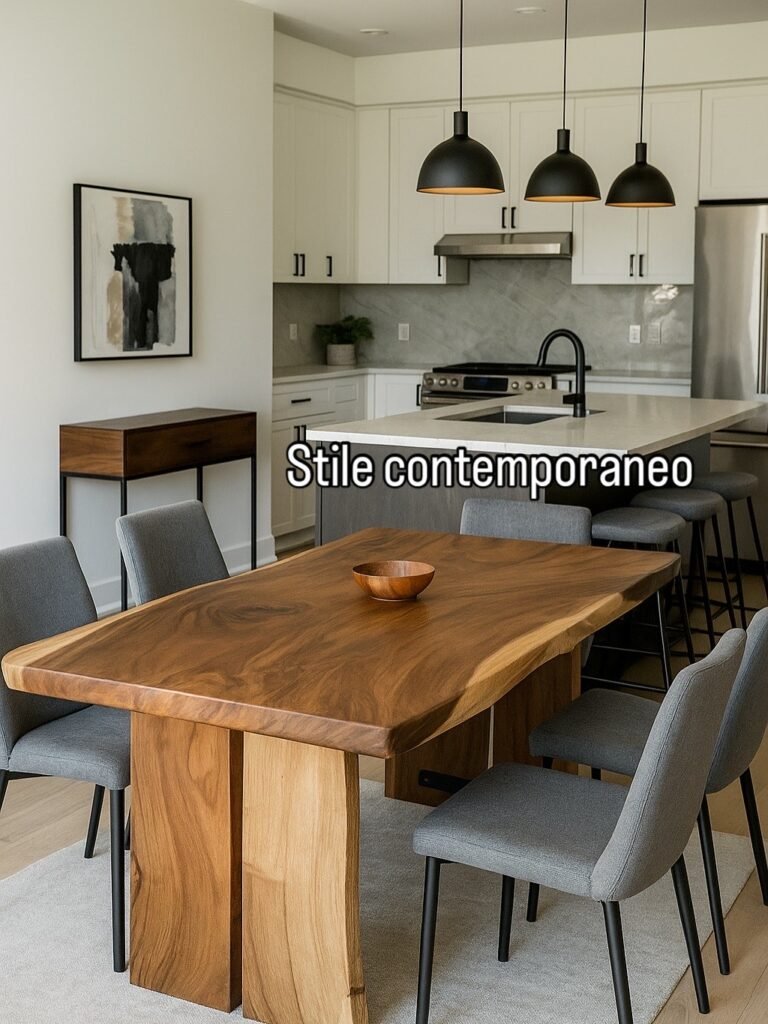 Il contemporaneo unisce estetica e funzionalità. Qui, il tavolo in legno massello di acacia levigato a mano diventa una scultura d’arredo, con linee geometriche e finiture impeccabili. Abbinato a sedie moderne e lampade di design, porta un tocco di lusso artigianale in qualsiasi casa.