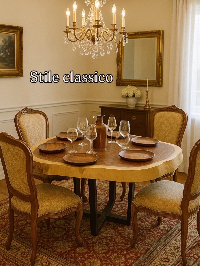Lo stile classico tradizionale valorizza qualità e storia. Un tavolo artigianale in legno massello di acacia, in finitura naturale o scurita, esprime forme morbide, proporzioni armoniche e dettagli curati. Abbinato a mobili in legno scuro, tappeti persiani e lampadari in vetro, diventa il protagonista di ambienti eleganti e intramontabili.